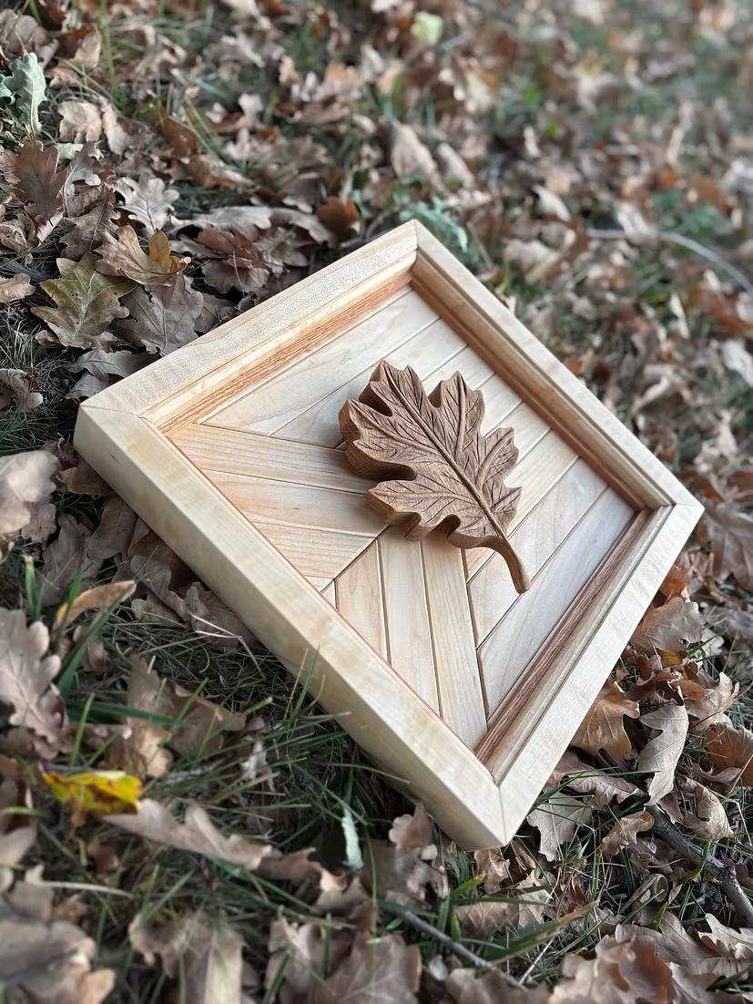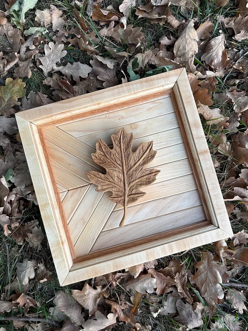 This piece is made from real hardwoods and built by hand. Details are meticulously hand cut, hand carved and shaped by me.This piece measures 11.5" x 11.5" and showcasing the natural beauty of a maple mosaic pattern backing and frame, red oak inner frame accent, and a white oak raised, hadn't carved and shaped leaf to offer a lifelike appearance. Oiled using walrus oil to bring out the natural grained beauty of the hardwoods used. This versatile piece can be effortlessly displayed using the included sawtooth hanger or elegantly placed on a shelf or console. Elevate your space with the timeless appeal and artisanal love embedded in every detail of Aurelian.
